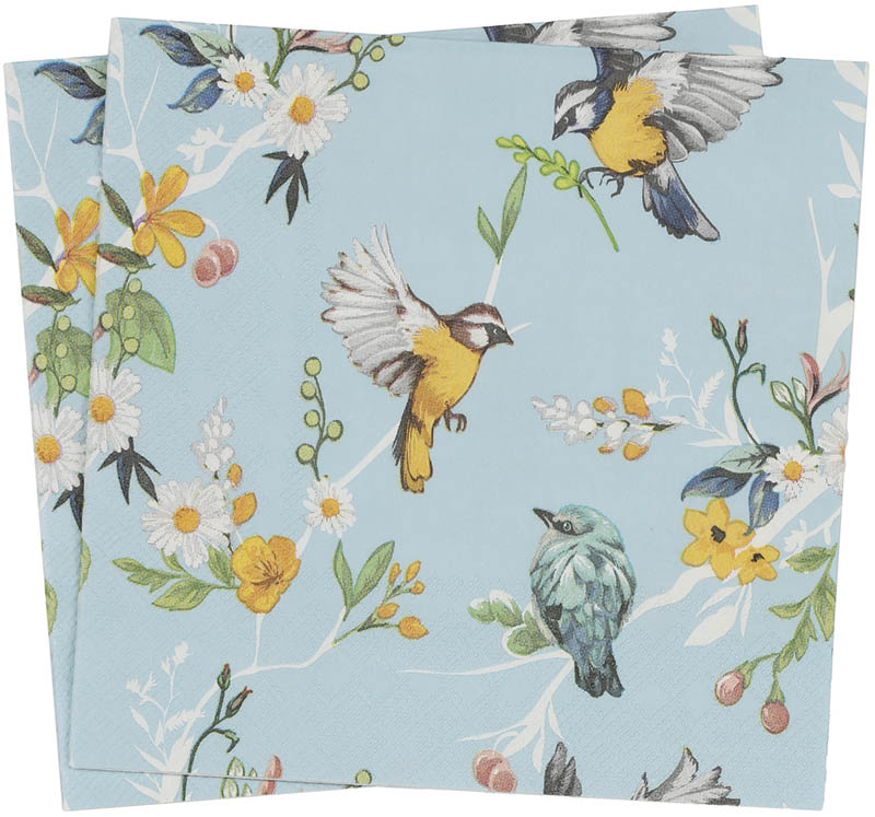 Fargerike papirservietter med fugl- og blomstermotiv. Et nydelig design som gir borddekkingen et sommerlig preg – perfekt til både hverdagsmåltider, festlige anledninger, sommerfester og som en liten gave.