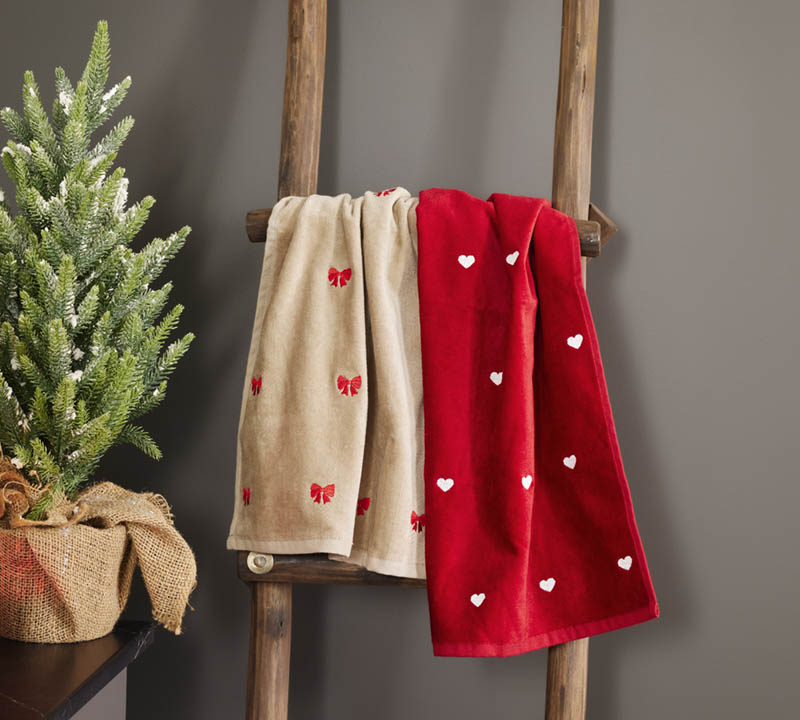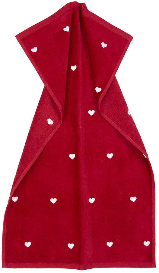 Dekorativt gjestehåndkle i myk velour, brodert med fine hjerter. Det enkle, delikate designet og den røde fargen skaper en lun og innbydende julestemning på badet.