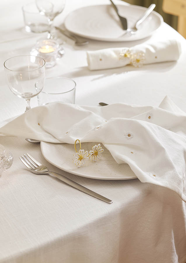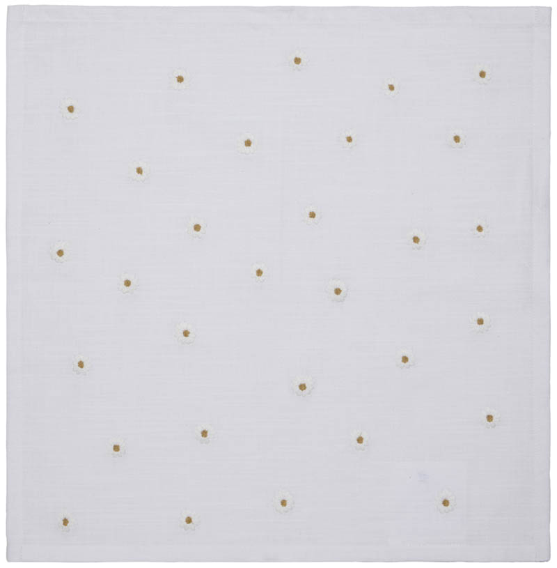 Søt tøyserviett med broderte prestekrager. Like fin til sommerfest og bursdag som til andre festlige anledninger – og når du vil dekke et ekstra innbydende bord i hverdagen.