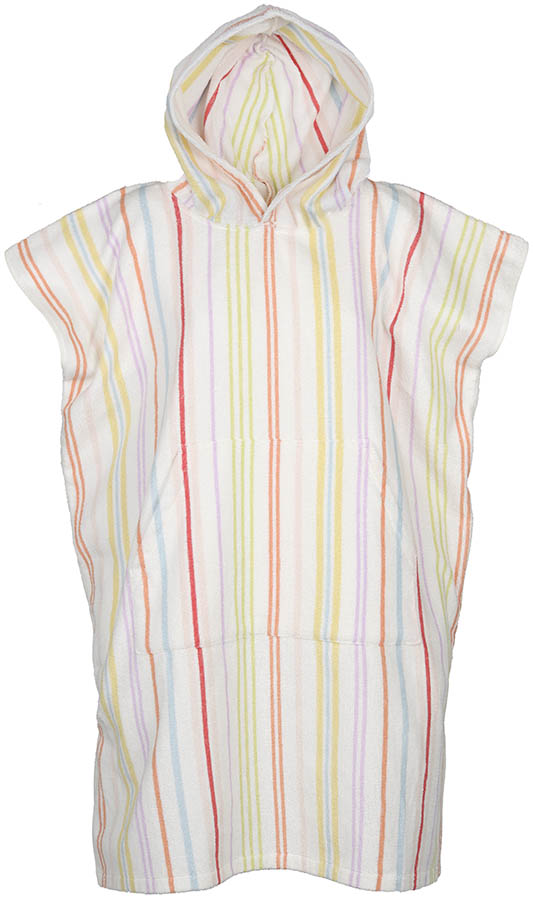 Den hvite bunnen med freshe, stripete detaljer gir et lett og sommerlig uttrykk. En funksjonell poncho i behagelig kvalitet som passer godt til både ferie og hverdagsbruk.
