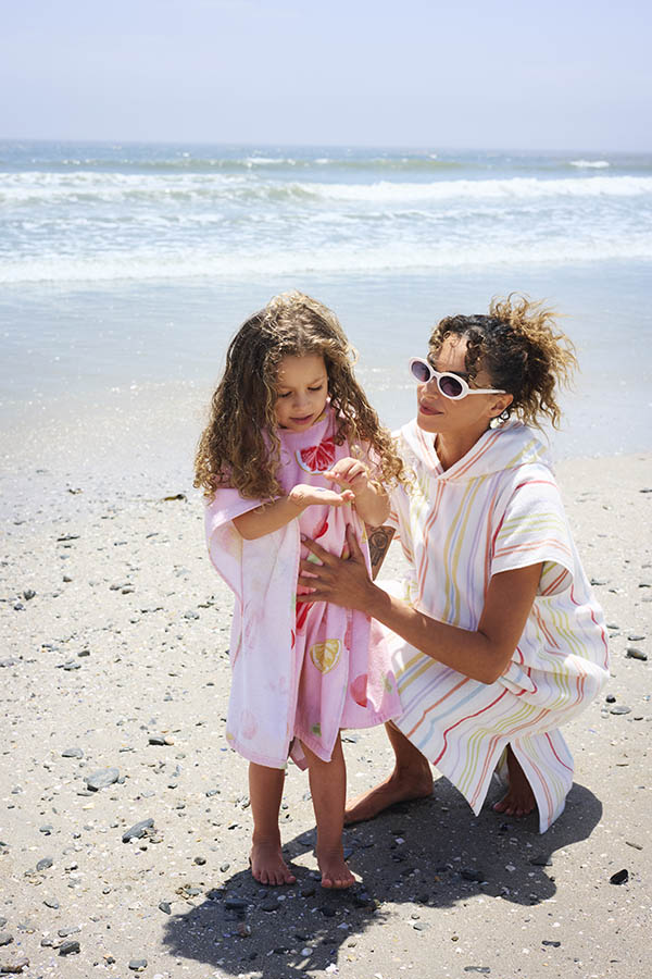 Praktisk og komfortabel badeponcho i myk bomullsfrotté som absorberer godt og tørker effektivt etter bading. Ponchoen har en romslig hette og en ledig passform som gjør den enkel å ta av og på – perfekt på stranden, ved bassenget eller etter dusj.