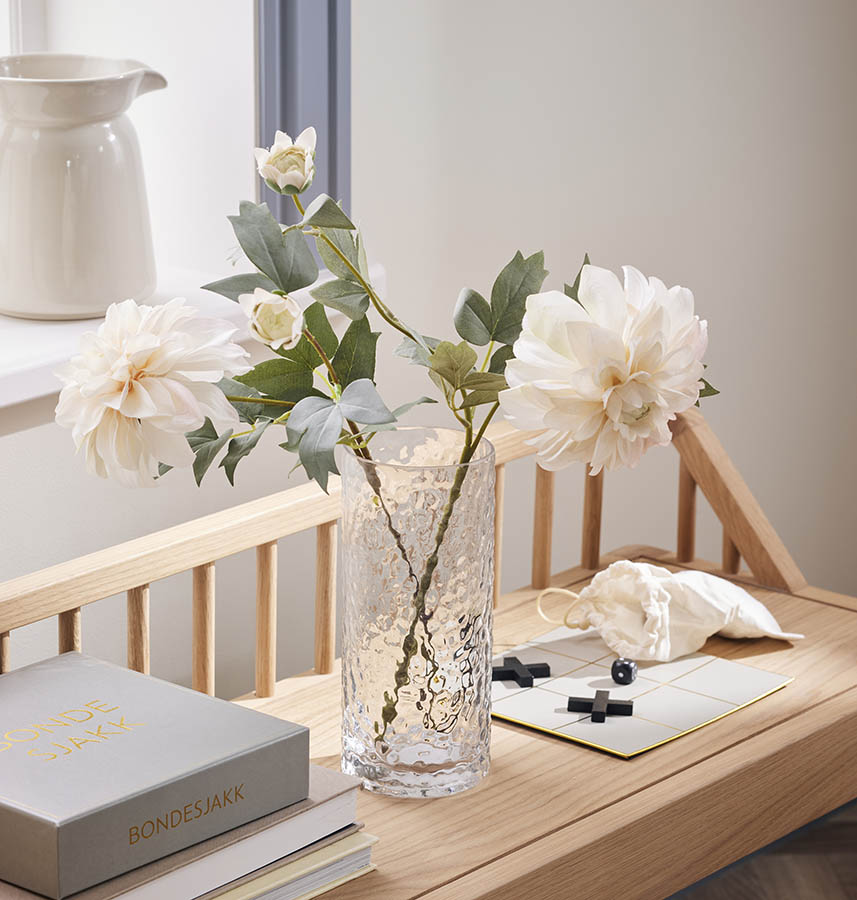 Tidløs vase i hamret glass med en klassisk form som passer til alle typer buketter – uansett sesong og stil. Den ruglete overflaten gir særpreg, mens det tykke glasset sikrer at vasen står tungt og stødig på bordet.