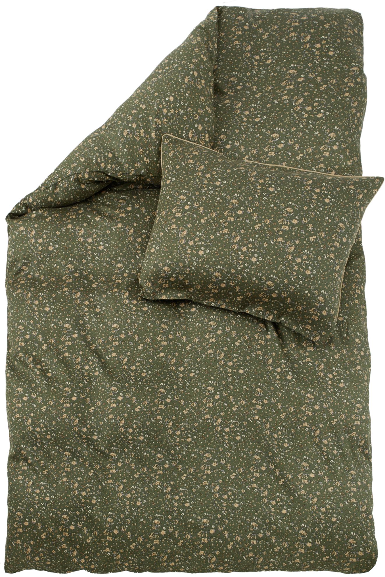 Småblomstret satengsengesett med skogsgrønn bunnfarge. Den myke kvaliteten gir en sval og behagelig følelse mot huden. Som en ekstra detalj har putevaret en dekorativ piping rundt kanten.