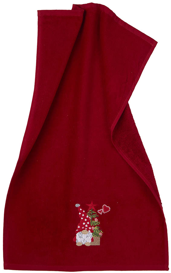 Søtt gjestehåndkle i myk velour, brodert med en sjarmerende nisse. Det koselige motivet og den dype røde fargen skaper en lun og innbydende julestemning på badet.