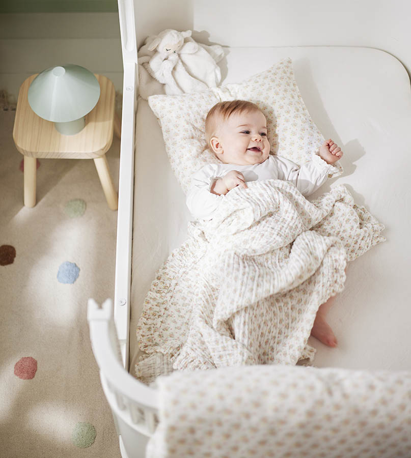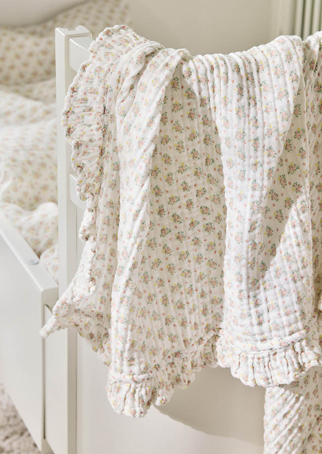 Søtt musselinteppe i myk, økologisk bomull – perfekt for sensitiv babyhud. Teppet har et koselig blomstermønster og en dekorativ volang rundt kanten. Det tynne musselinstoffet gjør det enkelt å svøpe teppet rundt babyen, og det kan også brukes som sutteklut, laken eller stelleunderlag.