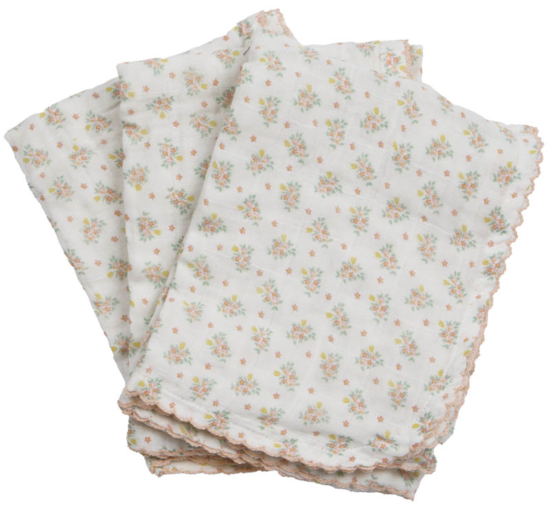 3-pk musselinkluter i myk, økologisk bomull – perfekt for sensitiv babyhud. Klutene har et søtt blomstermønster og en dekorativ kantsøm. Disse allsidige klutene kan brukes etter amming, ved spising, gulping, og når babyen begynner å få tenner og sikler mer.