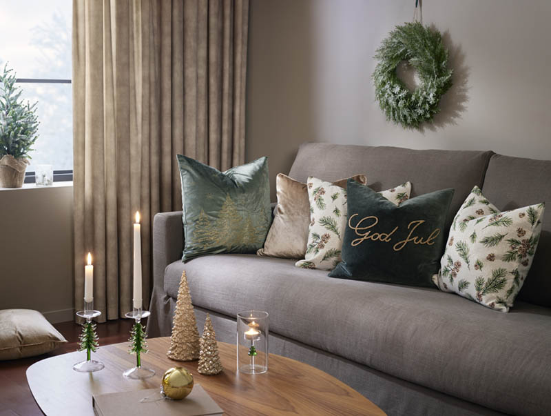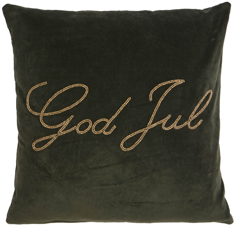 Elegant putetrekk i mørkegrønn velour med teksten «God jul» brodert med gullperler. Den lune fargen og myke kvaliteten, kombinert med det vakre broderiet, skaper en koselig og innbydende stemning i ethvert julehjem.