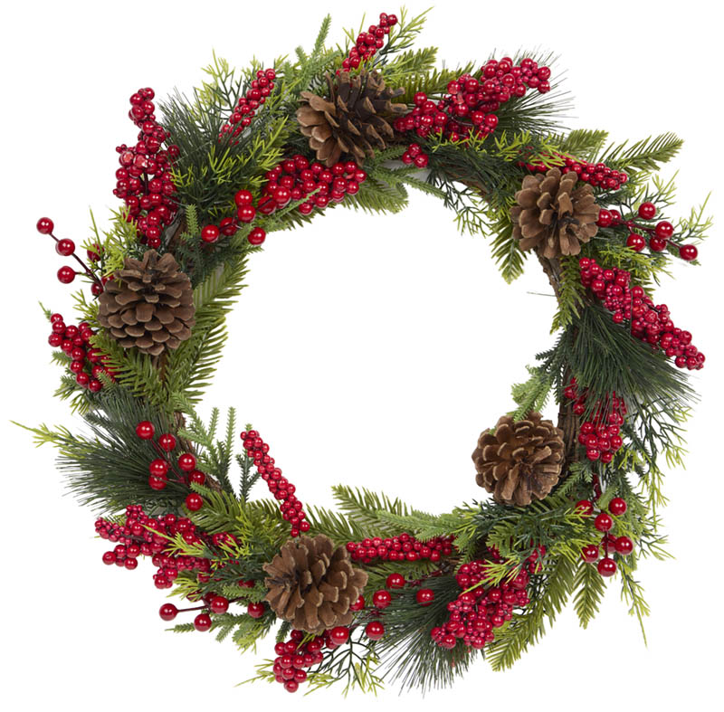 Krans med røde bær og kongler