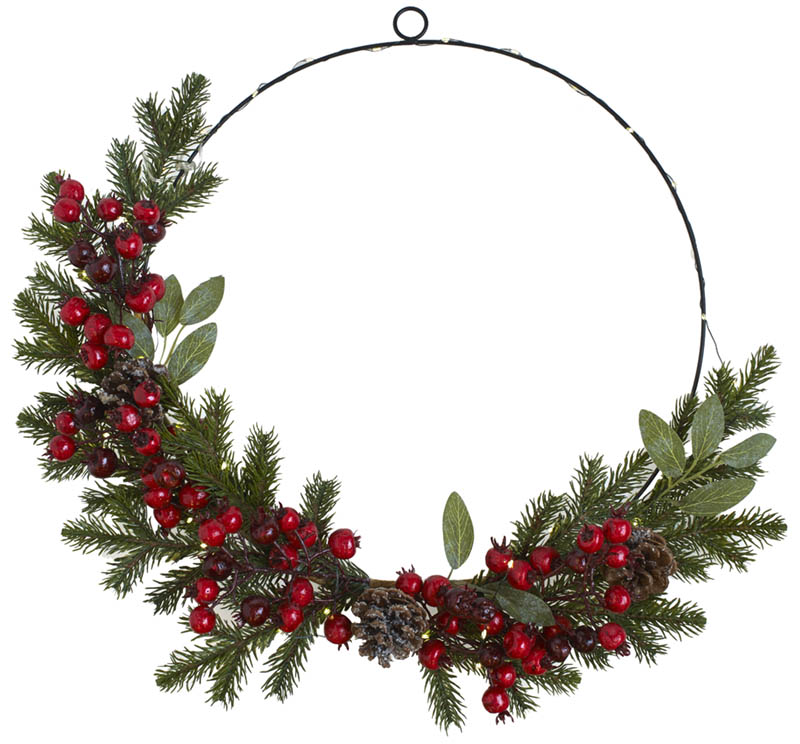 Vakker julekrans med grankvister, kongler og bær. Rundt kransen er det surret en lyslenke med LED-lys. Kan henges på veggen, settes på en hylle eller plasseres på døren. En klassisk juledekorasjon som skaper en koselig stemning i ethvert hjem.