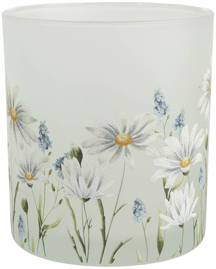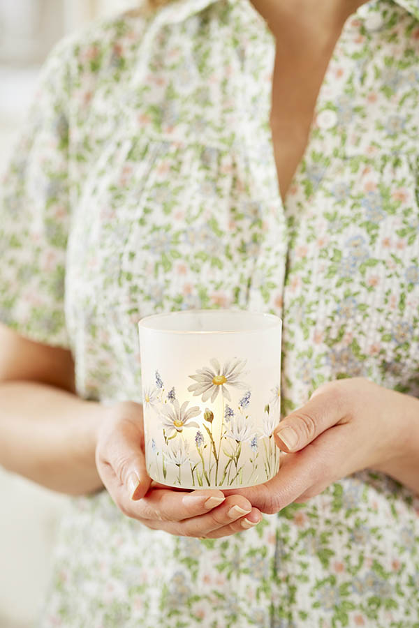 Vakker lykt i frostet glass, dekorert med et floralt mønster i duse farger. Lykten passer både til små og store telys, og motivet kommer ekstra godt frem når lyset tennes.