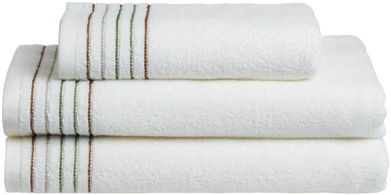 Stilig håndkle med dekorative striper på hver side. Kommer i slitesterk bomullsfrotté som tåler mange vask. Lett og luftig kvalitet som tørker fort. Kombiner med andre håndklær etter egen smak.