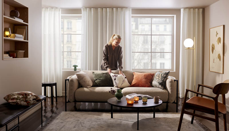 Mellomtykk gardin i myk boucle med røff overflate. En kvalitet som gir en lun og koselig atmosfære i rommet. Gardinen henges opp med rynkebåndskroker, enten på skinne eller stang. Den kommer i to lengder, hvorav den ene er ekstra lang – perfekt hvis du ønsker å henge gardiner fra tak til gulv.