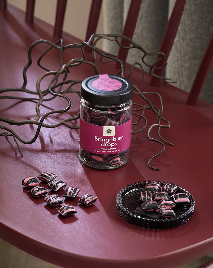 Lekre drops med smak av bringebær og lakris – en kjent og kjær kombinasjon som garantert vil glede enhver søtmons. Kommer i en dekorativ glasskrukke, like fin å gi bort som å nyte selv.