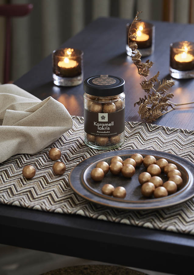 Kjempegode lakriskuler trukket med bronsefarget karamellsjokolade – en lekker smak med et luksuriøst utseende! Kommer i en dekorativ glasskrukke – perfekt som en liten gave, eller når du vil unne deg noe ekstra godt.