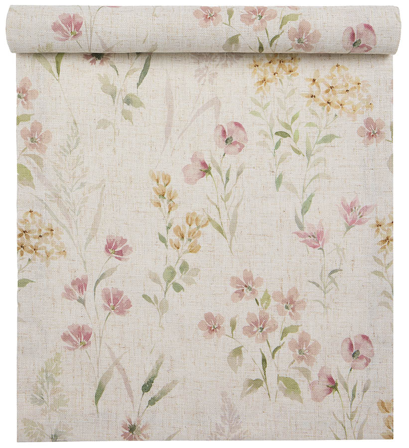 Blomstermønstret bordløper i duse farger som gir rommet et lyst, vårlig preg. Stoffet har innslag av lin som tilfører tekstur og en naturlig, lett røff overflate.