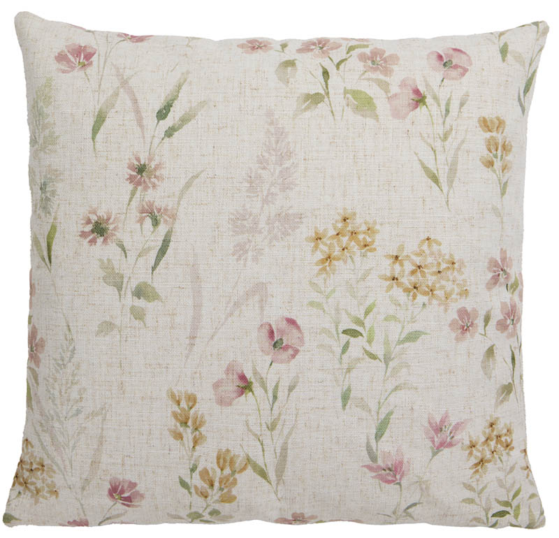 Blomstermønstret putetrekk i duse farger som gir rommet et lyst, vårlig preg. Stoffet har innslag av lin som tilfører tekstur og en naturlig, lett røff overflate.