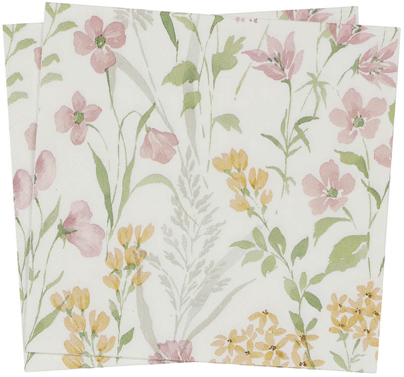 Papirservietter prydet med vakre blomster på kremfarget bunn. De delikate fargene og det fine motivet skaper en lys og innbydende atmosfære, perfekt for både hverdagsmåltider og festlige anledninger. Et design som setter prikken over i-en på ethvert vår- eller sommerbord!