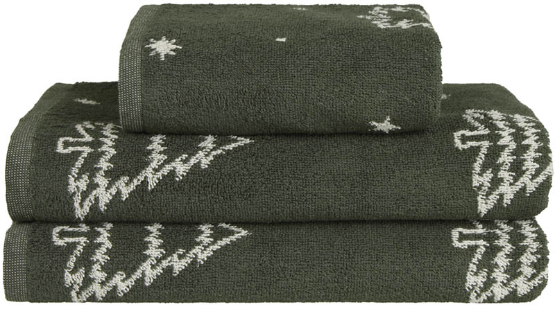 Grønt julehåndkle trykket med granbar og kongler. Det tidløse designet bringer naturens ro inn på badet, og passer like godt i adventstiden som i julen og utover vinteren – enten hjemme eller på hytta.