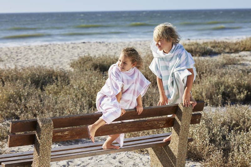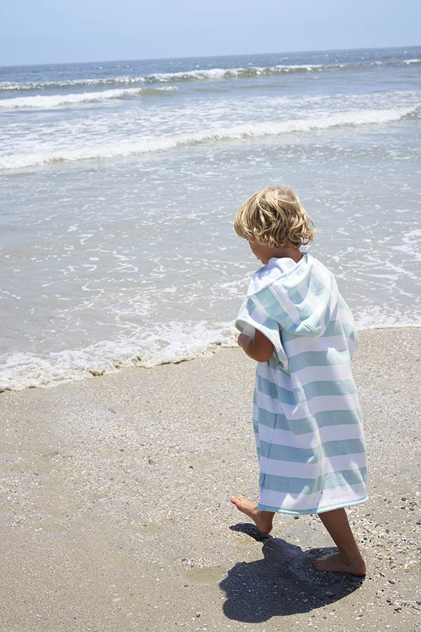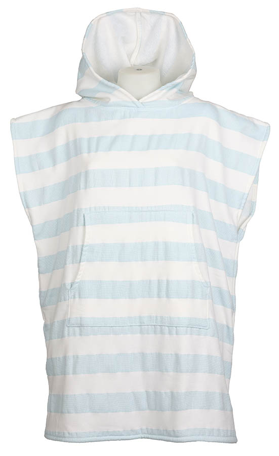 De blå og hvite stripene gir et friskt og sommerlig uttrykk. En komfortabel og praktisk poncho som passer perfekt til lange dager i solen.