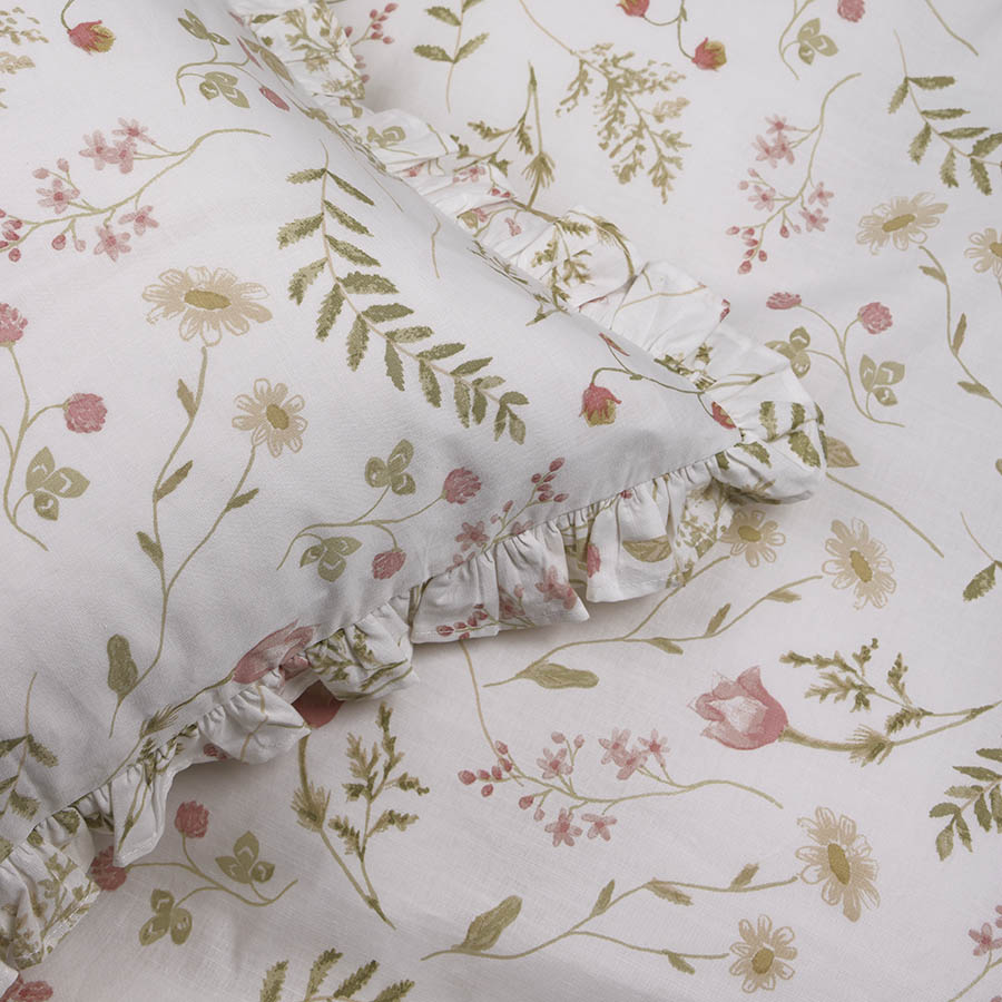 Mykt og slitesterkt sengesett i slubvevd bomull – en lett teksturert kvalitet med et rustikt og avslappet uttrykk. Det delikate naturmønsteret tilfører soverommet en harmonisk atmosfære, og den søte volangen rundt putevaret gir designet det lille ekstra.