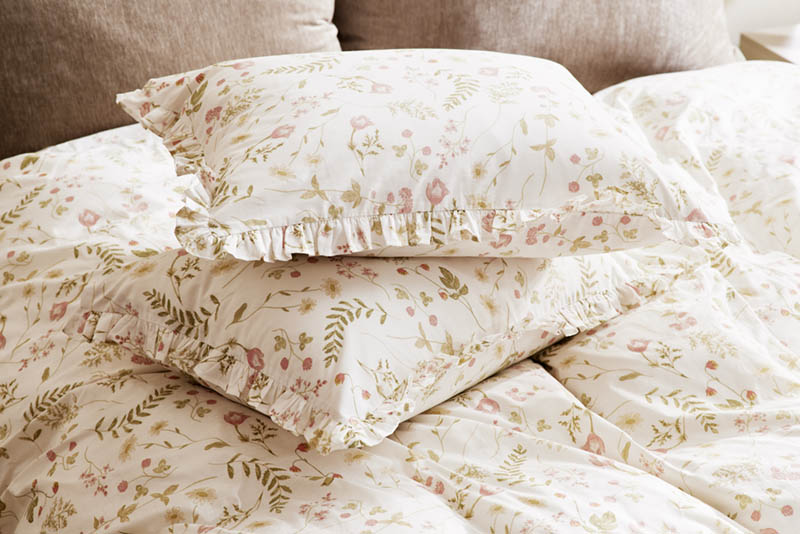 Sengesett med naturmønster og volang