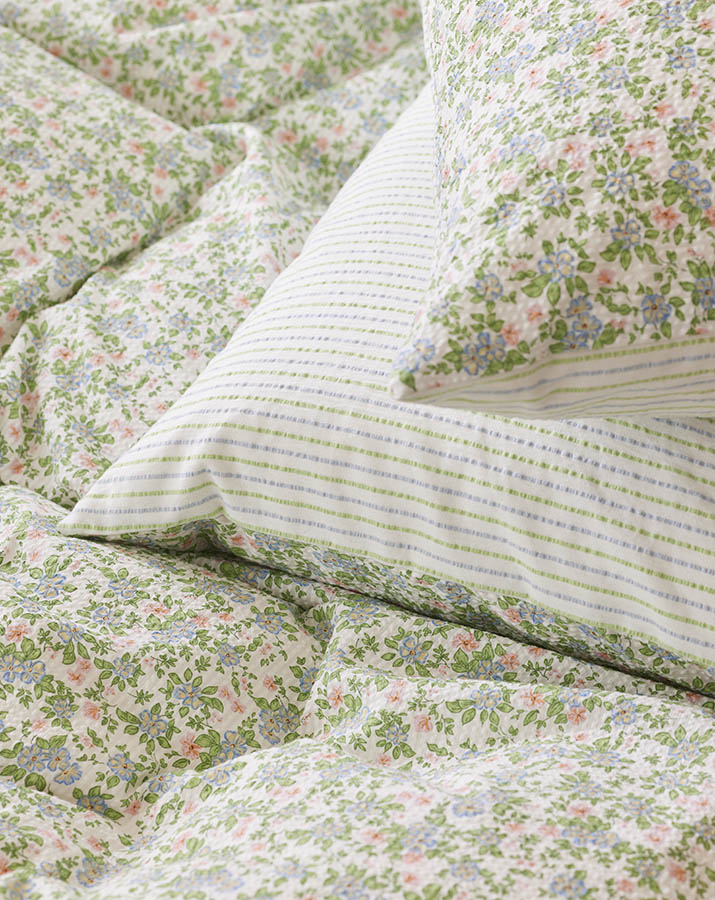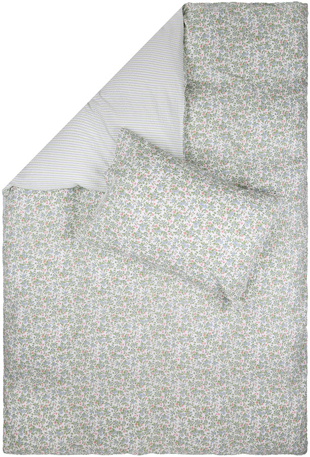 Nydelig sengesett i sval bomullskrepp. Sengesettet er tosidig, med et floralt mønster på ene siden og striper på andre siden. Stoffet er garnfarget, noe som gjør det ekstra slitesterkt og fargebestandig. Perfekt for deg som ønsker lett og luftig sengetøy i en kvalitet som varer.
