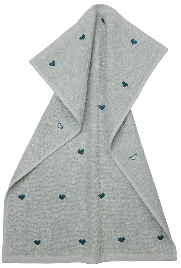 Dekorativt håndkle med broderte hjerter. Perfekt som håndhåndkle eller gjestehåndkle på badet – men passer like fint på kjøkkenet. Det søte mønsteret og den delikate fargen tilfører rommet et koselig uttrykk.