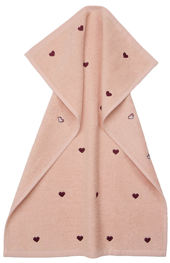 Dekorativt håndkle med broderte hjerter. Perfekt som håndhåndkle eller gjestehåndkle på badet – men passer like fint på kjøkkenet. Det søte mønsteret og den delikate fargen tilfører rommet et koselig uttrykk.