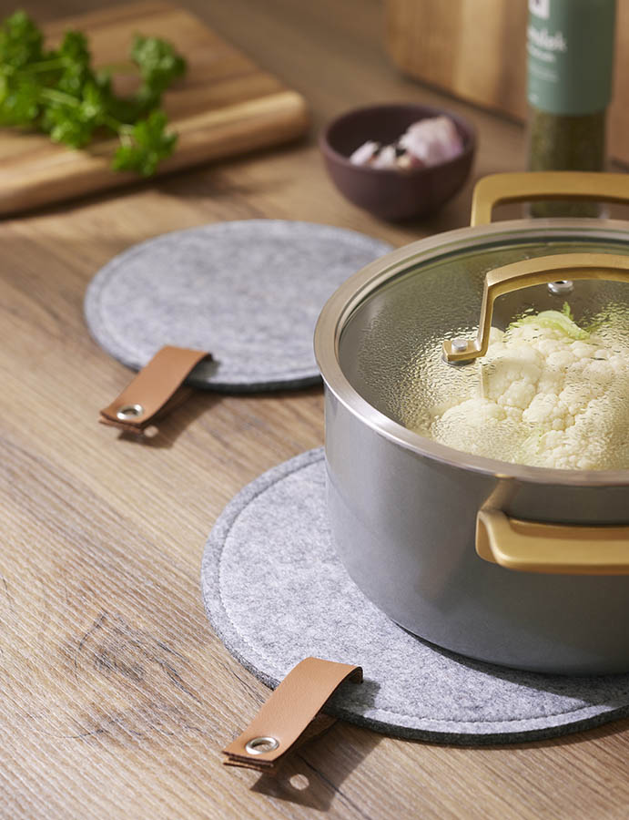 2-pk runde gryteunderlag i filt. Underlagene har en fin søm rundt kanten og hempe i imitert skinn. Det tykke materialet beskytter bordet for varme kasseroller, gryter og stekepanner.