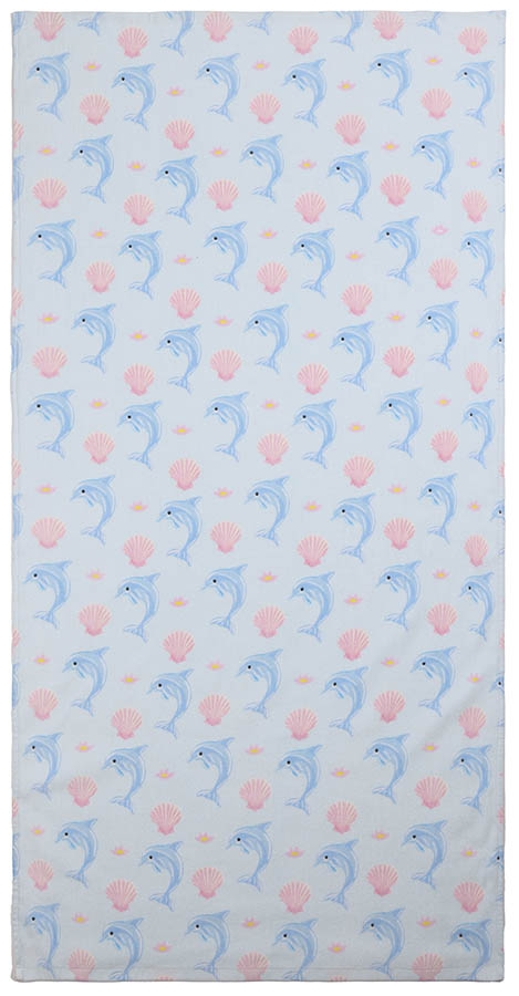 Den lyseblå bunnen er dekorert med søte delfiner, rosa skjell og små blomster som gir et lekent og sommerlig havpreg. En poncho som gjør badestunden ekstra morsom for små badegjester.