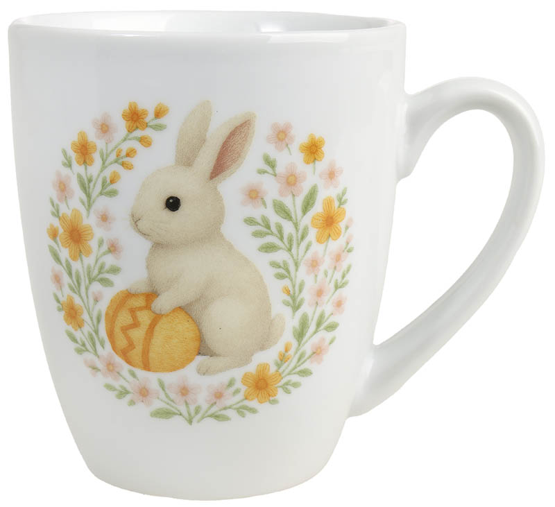 Kopp dekorert med påskemotiv i nostalgisk og klassisk stil, med hare, påskeegg og blomster i myke pastellfarger. Passer godt til kaffe, te eller kakao i påsketiden.
