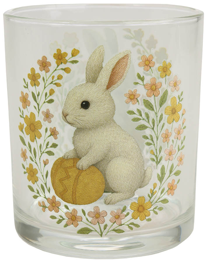 Lyslykt i glass med dekorativt påskemotiv i nostalgisk og klassisk stil, med hare, påskeegg og blomster i myke pastellfarger. Gir et stemningsfullt uttrykk på bord, hylle eller vinduskarm i påsketiden.