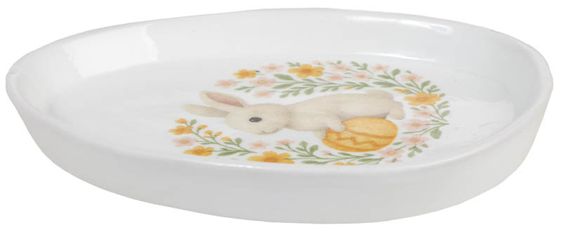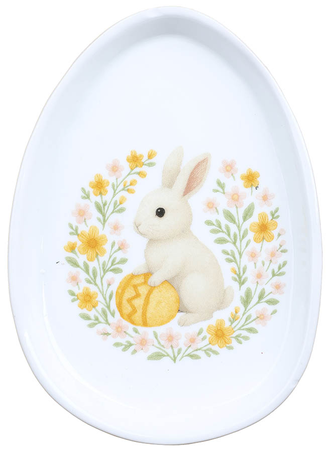 Eggformet fat dekorert med påskemotiv i nostalgisk og klassisk stil, med hare, påskeegg og blomster i myke pastellfarger. Egner seg godt til servering av småretter, godteri eller som en dekorativ del av påskebordet.