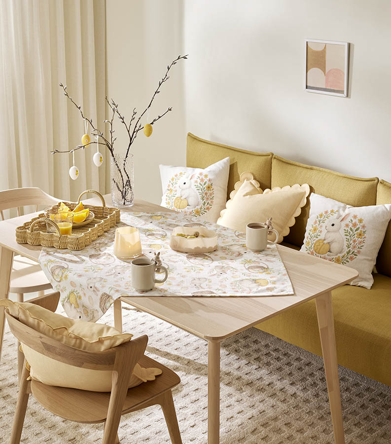 Pynteputetrekk med påskemotiv på forsiden og ensfarget bakside. Putetrekket er dekorert med påskemotiv i nostalgisk og klassisk stil, med hare, påskeegg og blomster i myke pastellfarger. Gir sofaen, stolen eller sengen et sesongtilpasset preg i påsketiden.