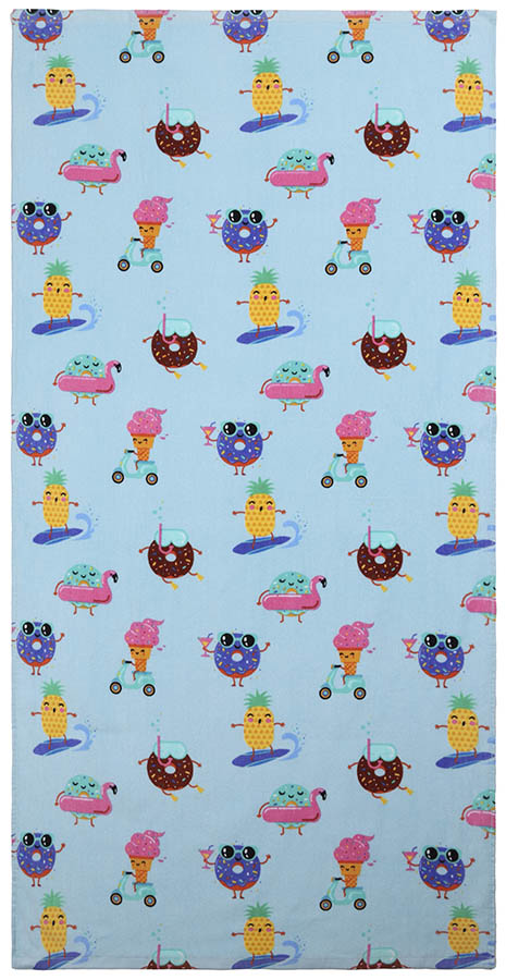 Den lyseblå bunnen er dekorert med lekne motiver av donuts, iskrem og ananas i glade farger som gir et morsomt og sommerlig uttrykk. Et fargerikt håndkle som gjør badestunden ekstra gøy for barna.