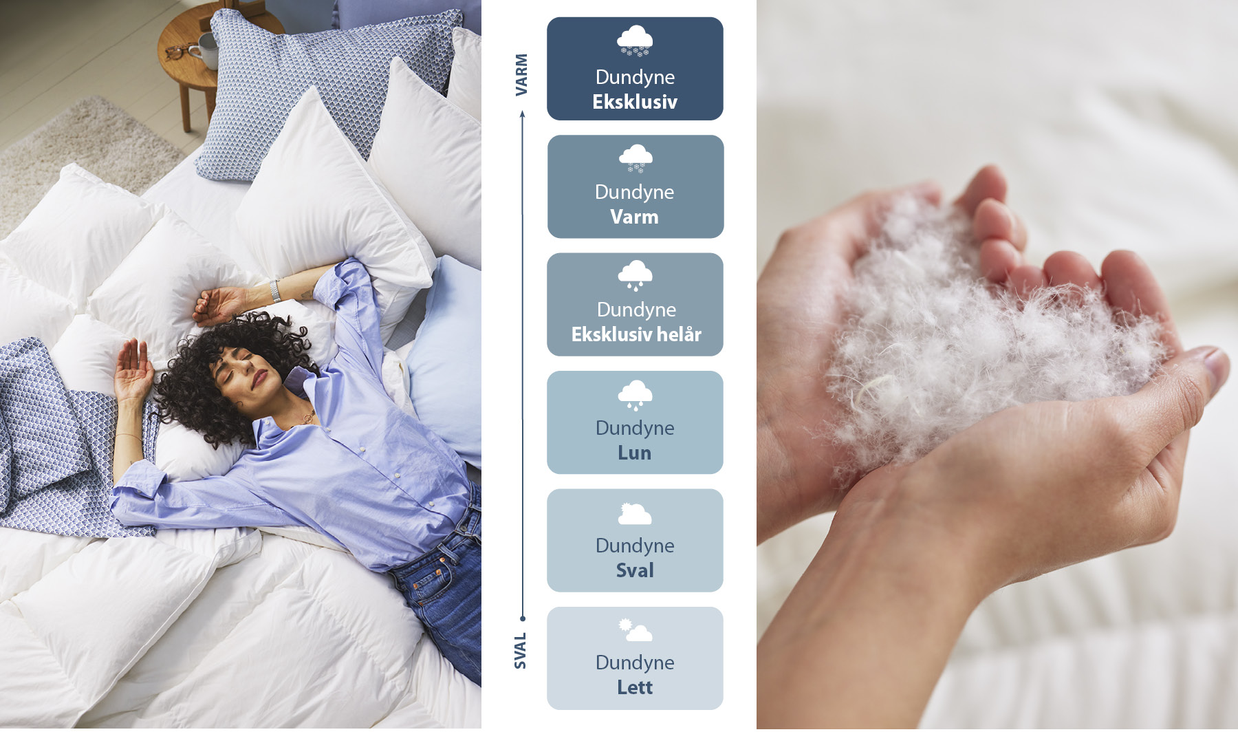 En flott dyne for vårt varierende sommerklima. Dunens naturlige egenskaper gjør at dynen svaler på varme netter, og holder deg varm på kjølige netter. Passer også godt som barnets første voksendyne.