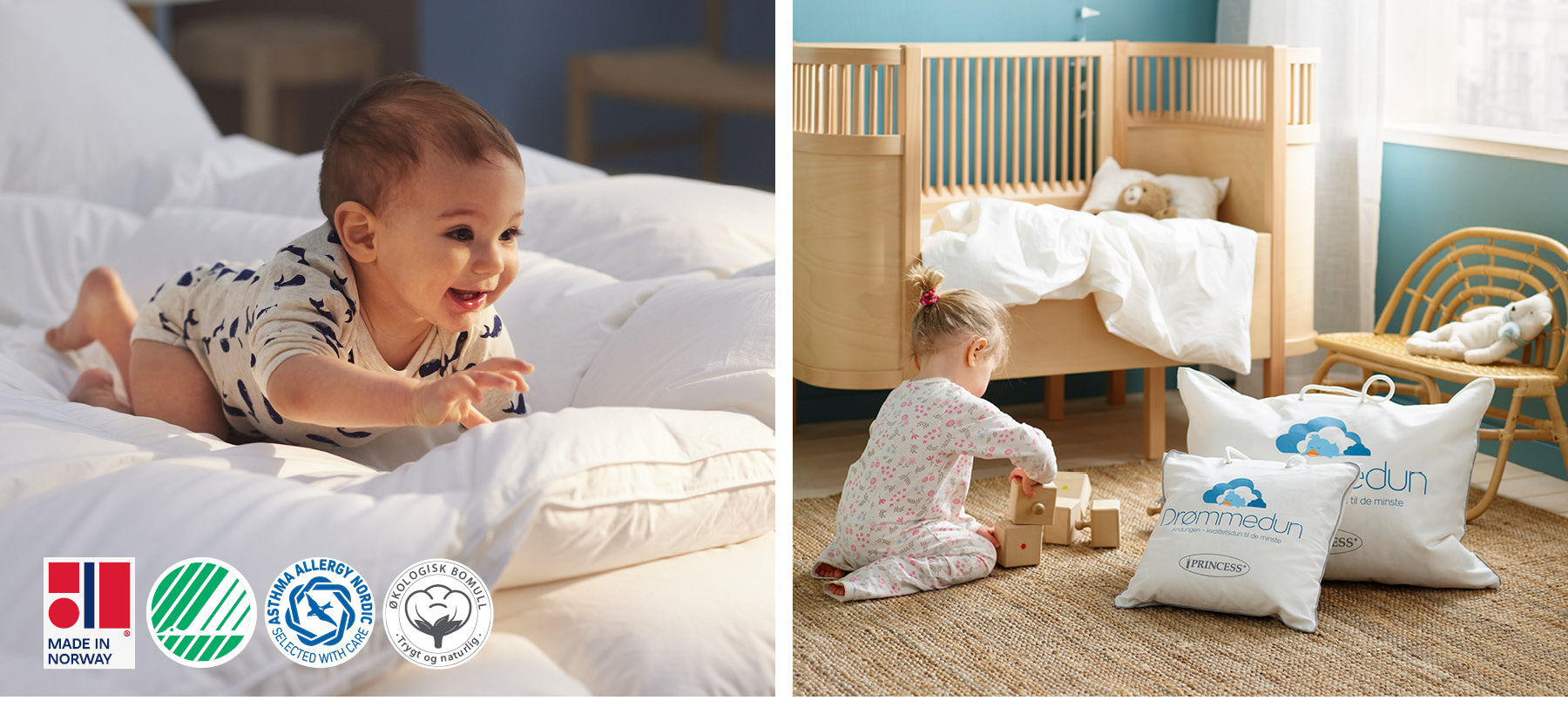 Dundyne til juniorseng. En lett og lun dyne som kan brukes hele året. Kombiner med pute i str. 40x60 cm.