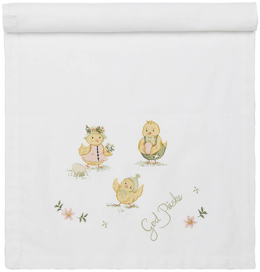 Løper med påskemotiv og teksten «God påske». Løperen er dekorert med påskekyllinger i en myk, nostalgisk illustrasjonsstil, med små blomsterdetaljer i dempede farger. Passer godt til spisebord, skjenk eller sofabord i påsketiden.
