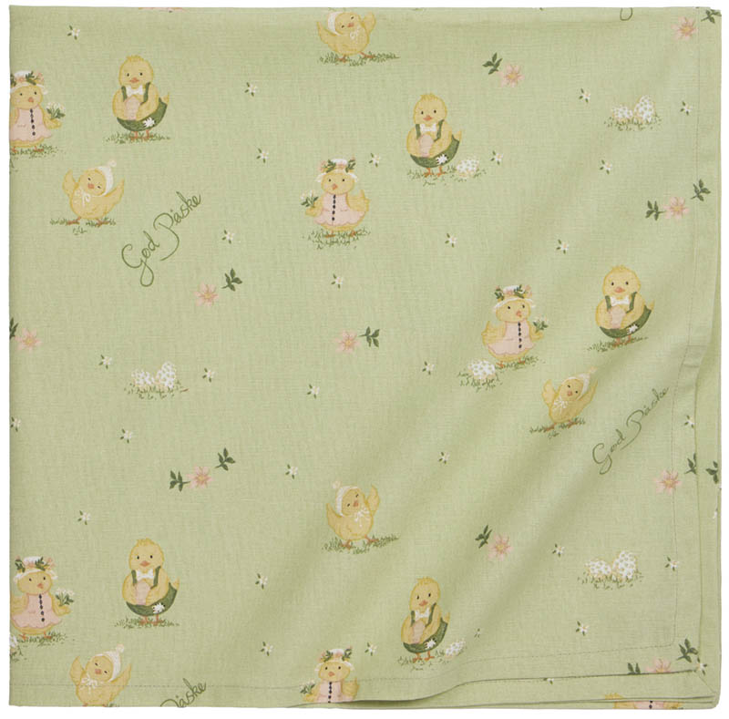 Liten duk dekorert med påskekyllinger i en myk, nostalgisk illustrasjonsstil og små blomsterdetaljer i vårlige farger. Duken passer godt til sofabord, sidebord eller som en dekorativ midtduk på et større bord.