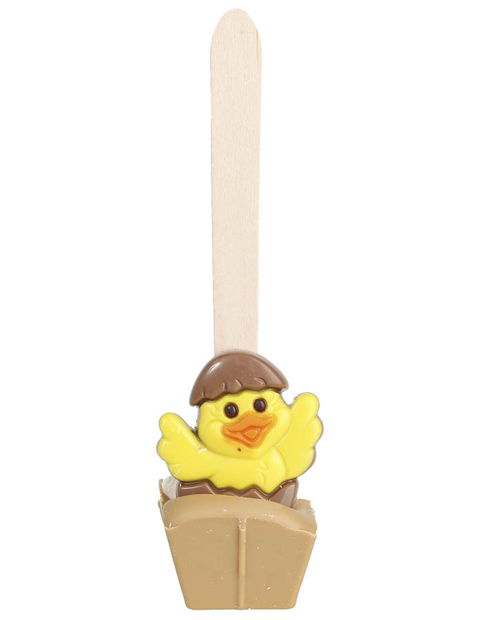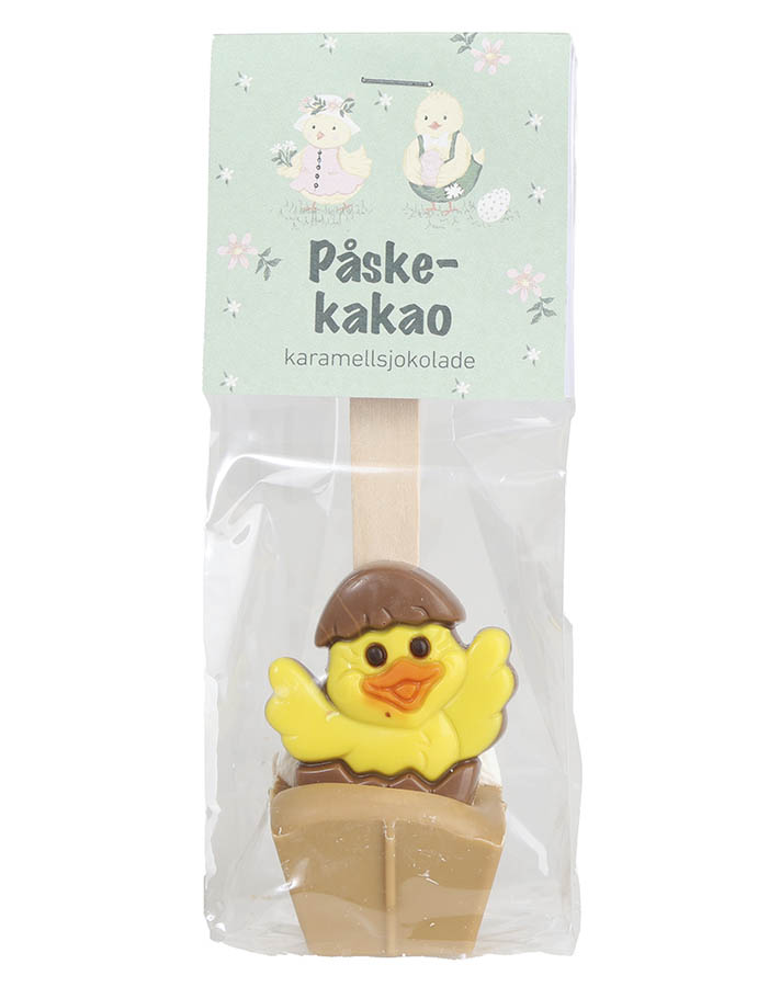 Kakaoskje formet som en påskekylling, laget av melkesjokolade. Hell varm melk i koppen, rør med skjeen til sjokoladen har smeltet, len deg tilbake og nyt en kopp kakao. Kakaoskjeen kommer i en fin gavepose og passer godt som en liten påskegave eller som noe ekstra til påskekosen.