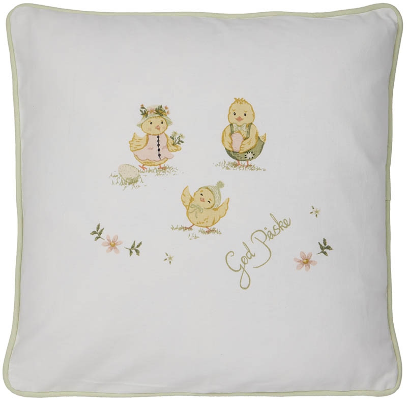 Pynteputetrekk med dekorativt påskemotiv og teksten «God Påske». Trekket er tosidig, med én side i lys bunnfarge med samlet motiv og én side i pistasjegrønn tone med gjentatt mønster av påskekyllinger og blomster. Gir sofaen eller stolen et mykt og stemningsfullt påskepreg.
