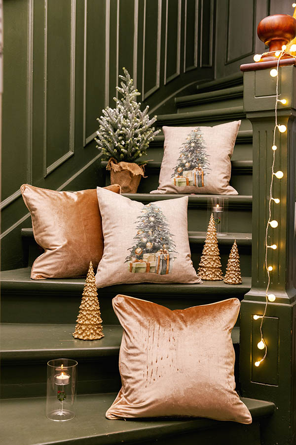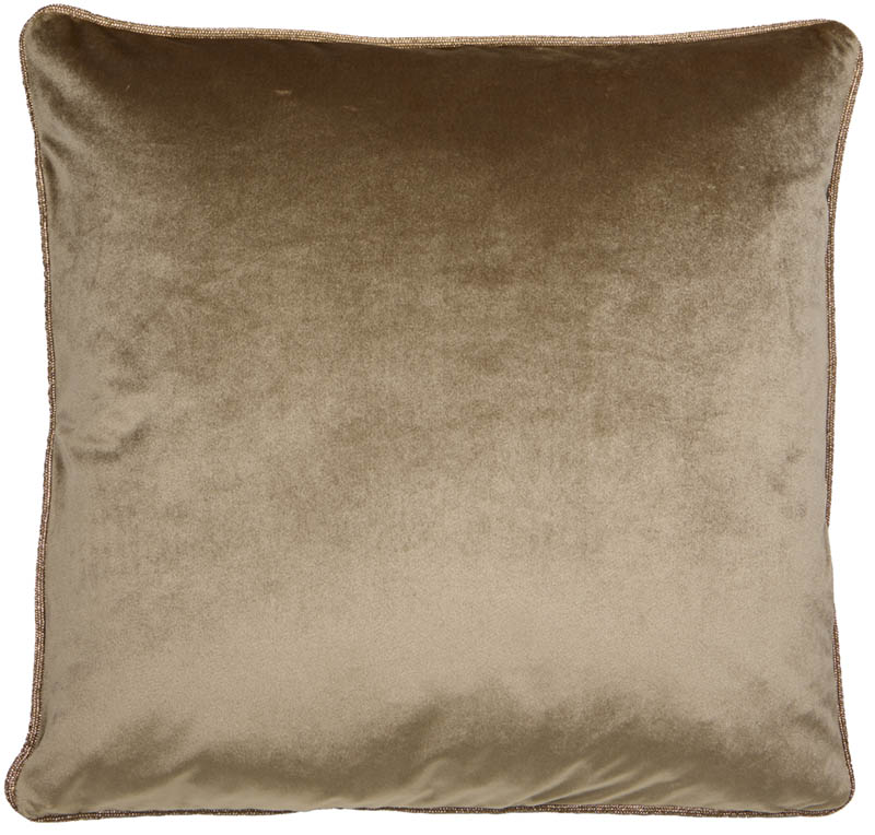 Beigefarget velourputetrekk med rosegullfarget piping – et elegant innslag i julehjemmet. Den myke kvaliteten og de diskré, glitrende detaljene gir en lun og varm atmosfære. Nydelig alene, eller i kombinasjon med andre puter fra kolleksjonen.
