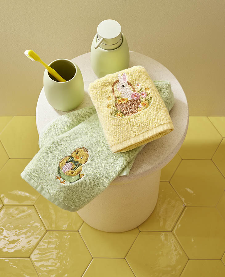 Mykt frottéhåndkle med brodert påskehare som gir et dekorativt påskepreg. Passer godt på badet eller gjestetoalettet i påsketiden, og kan også brukes som et sesongtilpasset håndkle på kjøkkenet.
