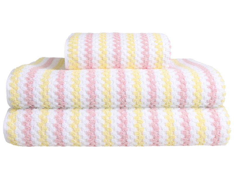 Den strukturerte frottéen gir fin kontrast sammen med glatte, ensfargede håndklær i gult, rosa eller hvitt for et helhetlig uttrykk.
