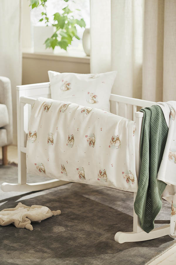 Babysengesett til vugge og barnevogn. Sengesettet kommer i økologisk sateng og har en myk og sval overflate. Har et trykket mønster av søte kaniner. Kombiner gjerne med andre produkter i serien.