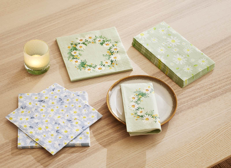 Rektangulære papirservietter prydet med prestekrager på grønn bunn. Det søte mønsteret gir borddekkingen en frisk og sommerlig stemning.