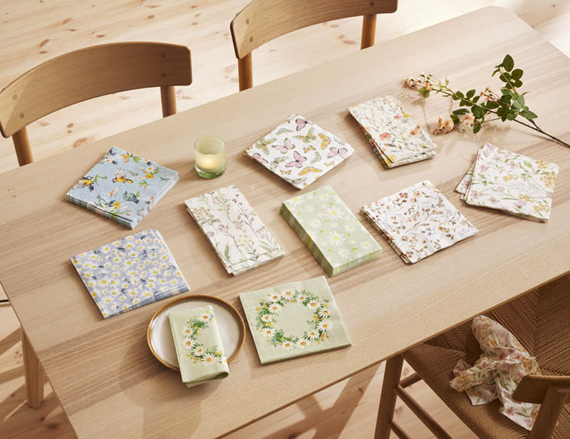 Papirservietter prydet med vakre blomster på kremfarget bunn. De delikate fargene og det fine motivet gir borddekkingen en lys og innbydende stemning.