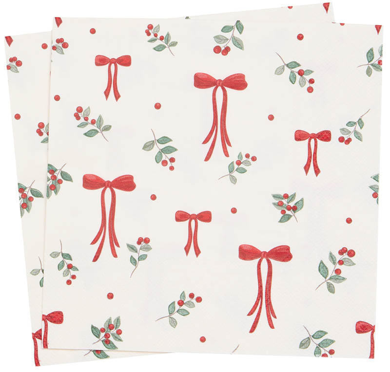 Papirservietter med dekorativt sløyfemønster. Det enkle delikate designet passer til alle høytidens måltider – fra frokost til middag. Serviettene er også fine som en liten gave.