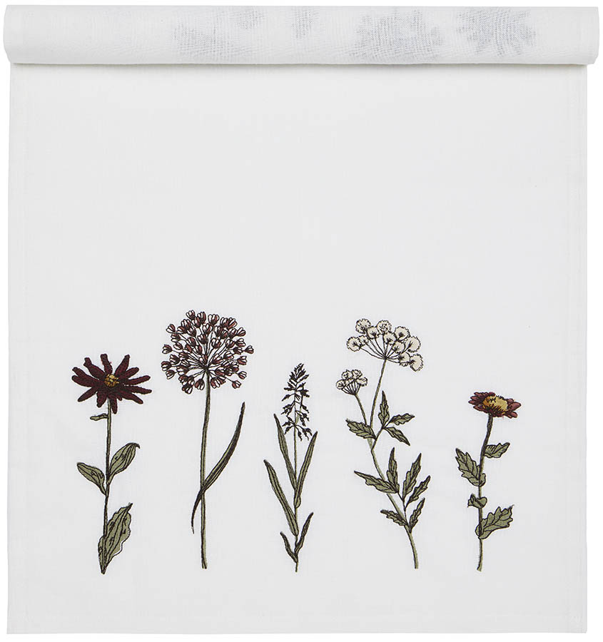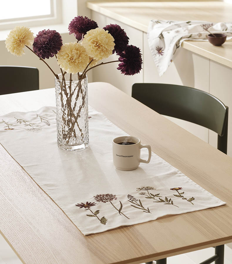 Liten bordløper med broderte blomster. Designet gir hjemmet en koselig atmosfære og følelse av spirende vår. Perfekt størrelse til sidebord, stuebord eller mindre kjøkkenbord.