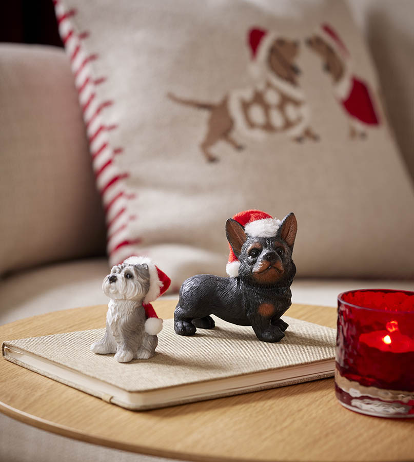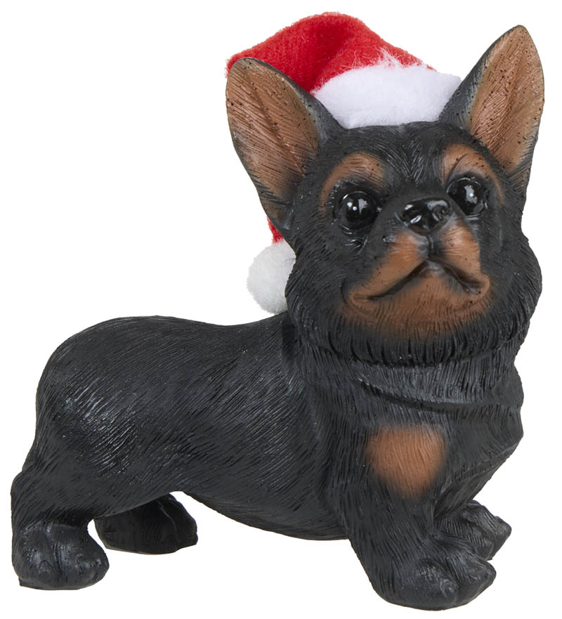 Sjarmerende dekorhund med rød lue – et nusselig blikkfang som sprer varme og julestemning. Perfekt for hundeelskere og alle som elsker koselig julepynt.